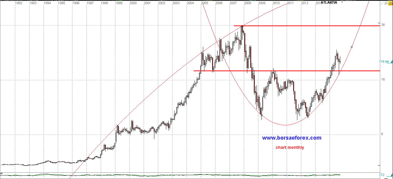 Nel breve termine sono possibili cedimenti fino a 17,80 dove si trova un importante supporto statico attivo ormai dal 2005. Qui aspettiamo il rimbalzo per valutare l'apertura di posizioni rialziste.
