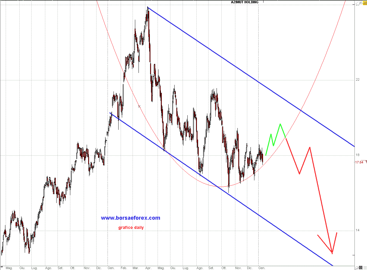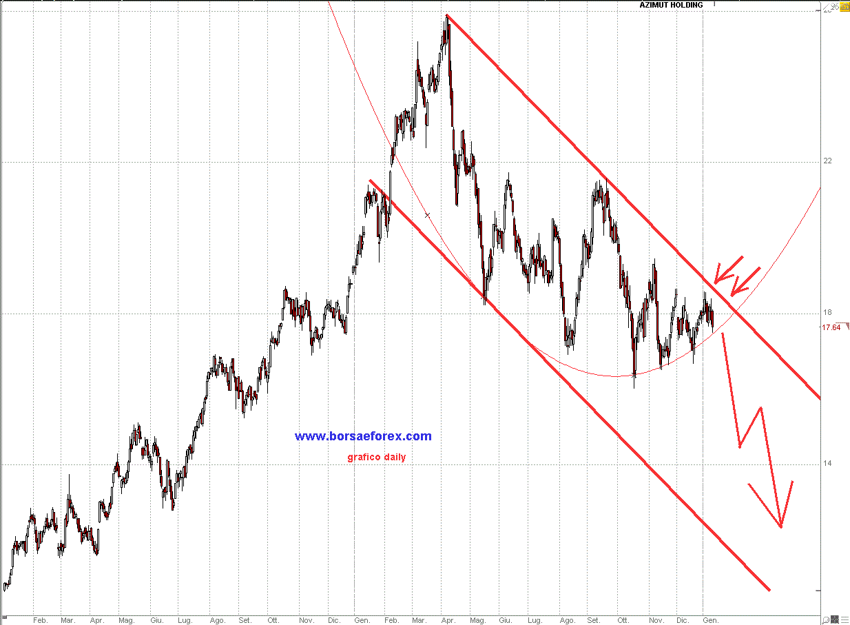 Il suo ciclo positivo pluriennale si è concluso ormai nell'agosto dell'anno scorso con massimi oltre i 25 euro ed i suoi movimenti si sono incanalati in un largo canale orientato negativamente che non promette niente di buono. Poi c'è il mercato azionario italiano con i suoi nuvoloni neri ormai vicini, anzi direi ormai sopra la testa non lasciano scampo ai prezzi del titolo che stanno facendo i conti con supporti sempre più deboli.