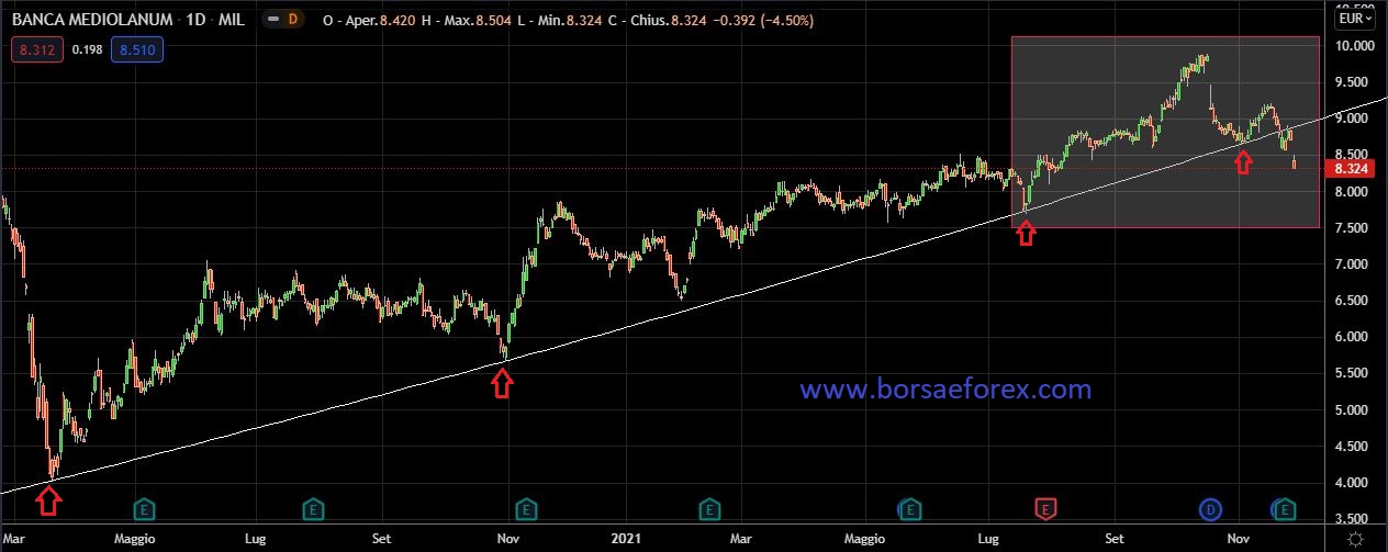 Nel grafico di oggi ho messo in evidenza la presenza di un supporto violato qualche giorno prima della notizia della scomparsa di Ennio Doris. Il movimento successivo è un pullback ribassista da manuale. Ho voluto inserire un secondo grafico con una zoomata degli ultimi tre mesi perchè il segnale merita di essere evidenziato.