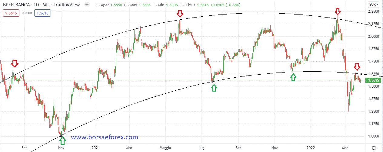 Grafico a un giorno - I prezzi si stavano muovendo all'interno di un canale abbandonato a seguito dell'aggressione russa ai danni dell'Ucraina. Il recupero dei giorni scorsi si è comunque attestato al di sotto dell'evolvente parabolica di supporto del canale parabolico abbandonato. I segnali non lasciano ipotizzare nel breve niente di buono.