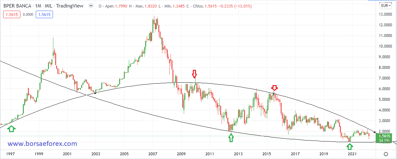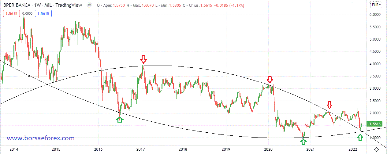 Grafico mensile - I prezzi si stanno muovendo lontano dal supporto in area 1 euro. Si avvicina l'incrocio dell'evolvente parabolica di resistenza con quella di supporto e di conseguenza si avvicina anche il momento di uscita del grafico da quest'area che genererà un segnale importante per valutare l'apertura di una posizione.