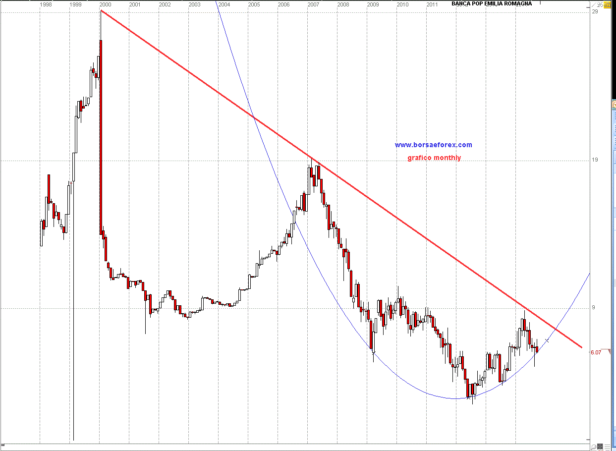 Non mi pare occorrano doti particolari per interpretare il grafico mensile di questa banca che mostra una linea di resistenza ribassista pluriennale. il trend quindi è ribassista salvo non arrivino segnali di violazione della resistenza.