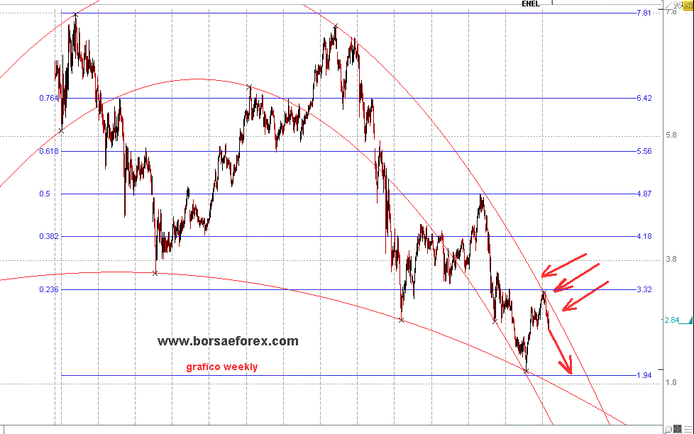 ENEL è uno dei titoli maggiormente presente nei portafogli dei cassettisti che in questi anni hanno sofferto e gioito. Eppure il business nel quale il titolo è inserito non avrebbe dovuto riservare sorprese. Questi sono i misteri del mercato. Ma non è finita, la situazione grafica nella quale si trova Enel è decisamente eloquente.
