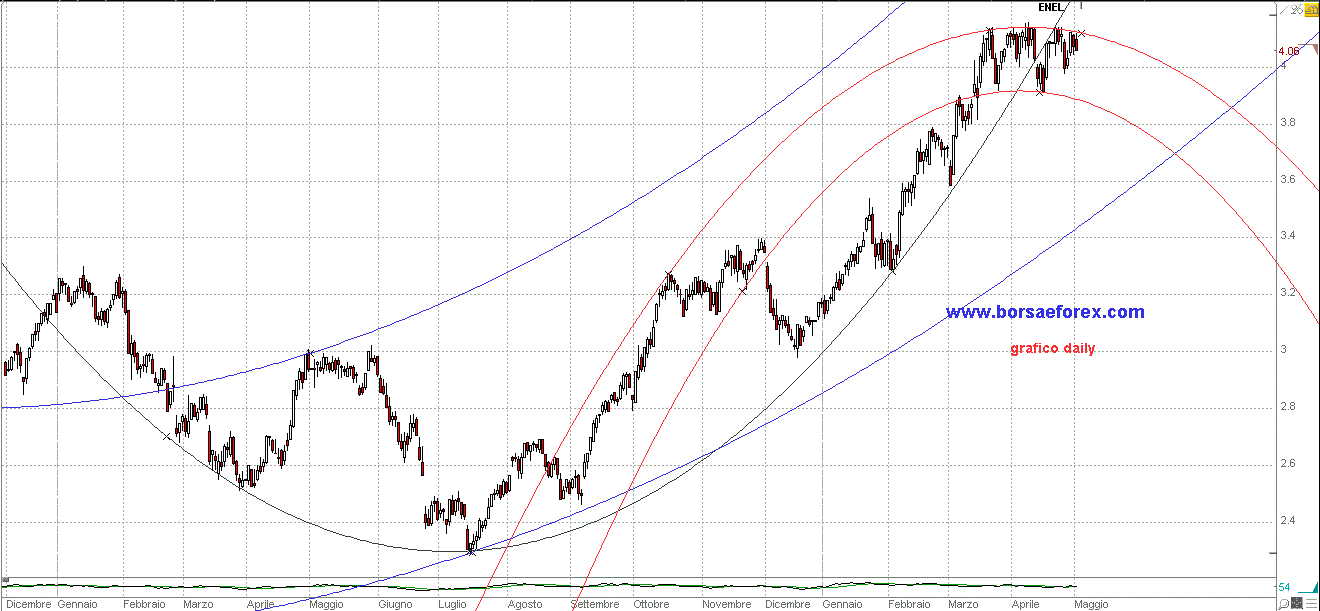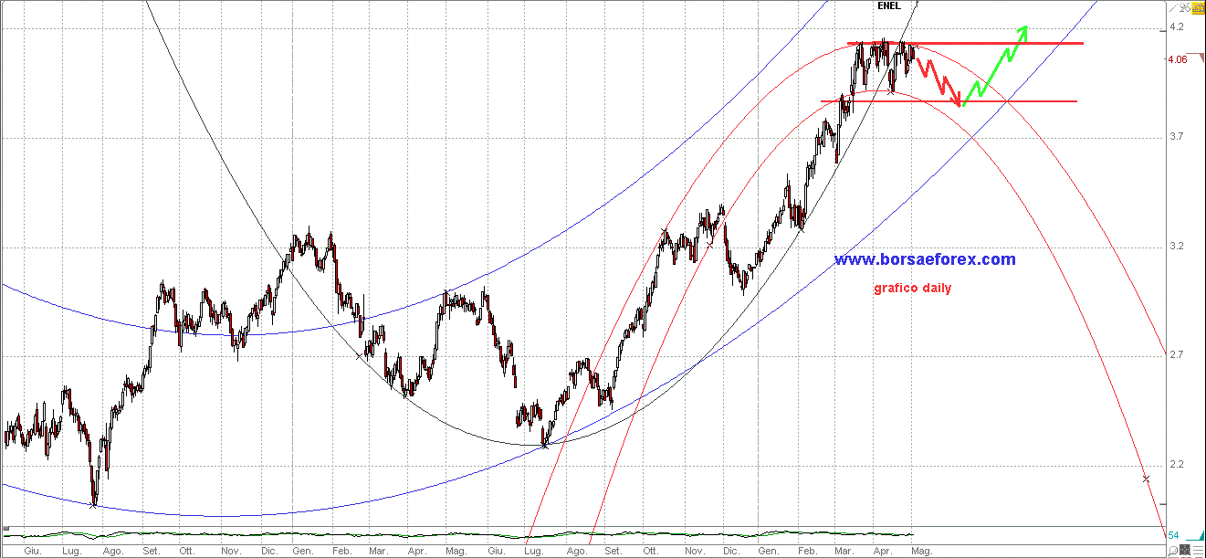L'ipotesi evolutiva più plausibile dovrebbe essere un susseguirsi di giornate positive e negative con escursioni di prezzo all'interno del canale parabolico rosso per le prossime 4 o 5 settimane con un percorso di avvicinamento all'evolevente parabolica di supporto azzurra del canale primario.