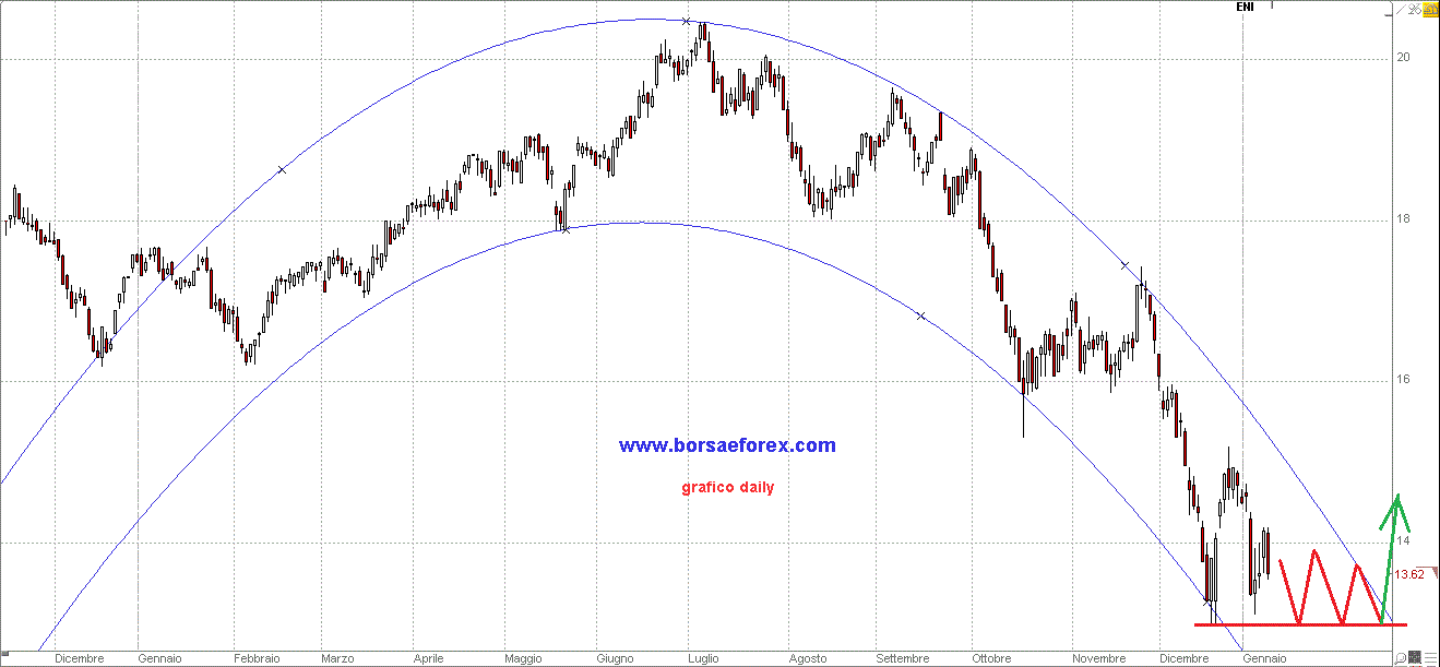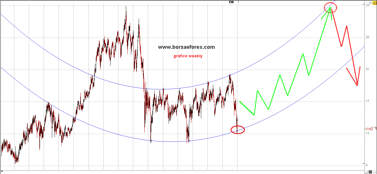 In questo momento è in corso il test del supporto identificato nell'analisi di novembre "ENI – è in armonia con il greggio" che potrebbe andare avanti per alcune settimane. Nel grafico settimanale ho evidenziato l'area di supporto a 13 euro la cui tenuta darebbe credito alla mia previsione pluriennale.