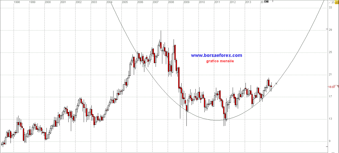 Quando ho iniziato a scrivere questo post volevo utilizzare un grafico che uso per Eni ormai storicamente, poi però mi sono reso conto che era troppo saturo di linee ed evolventi paraboliche che rendevano difficile la comprensione dei concetti fondamentali. Ho così optato per un grafico semplice che non può certamente confondere chi lo guarda e nel quale ho disegnato un'evolvente parabolica a sostegno del trend rialzista in corso.