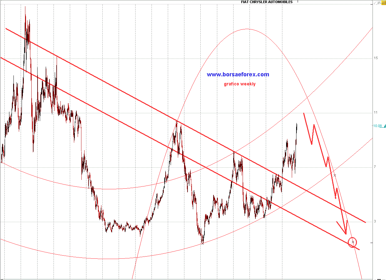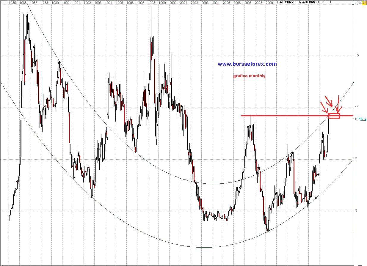 Quello che leggerete da qui in poi necessita di una premessa molto importante: il grafico di FCA è frutto di una fusione di titoli preceduta qualche anno fa da una scissione (ricordate CNH?), questo determina una potenziale situazione di errore dovuta alla scissione e poi fusione di diversi grafici.