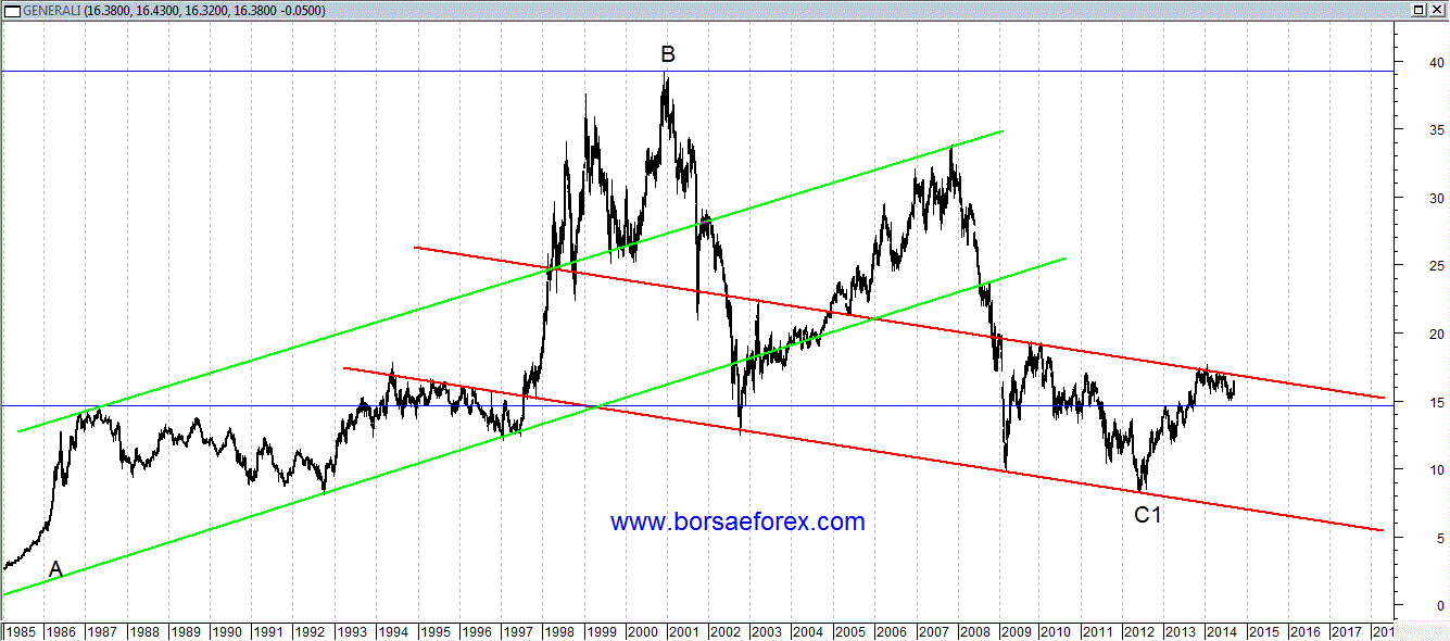 Sarà la tenuta o il cedimento della resistenza a dirci se il punto C1 è un minimo di fine ciclo (2000-2012) o solo un minimo relativo a cui seguirà in ulteriore minimo che potrebbe arrivare a 6 euro e che chiamerei C2.