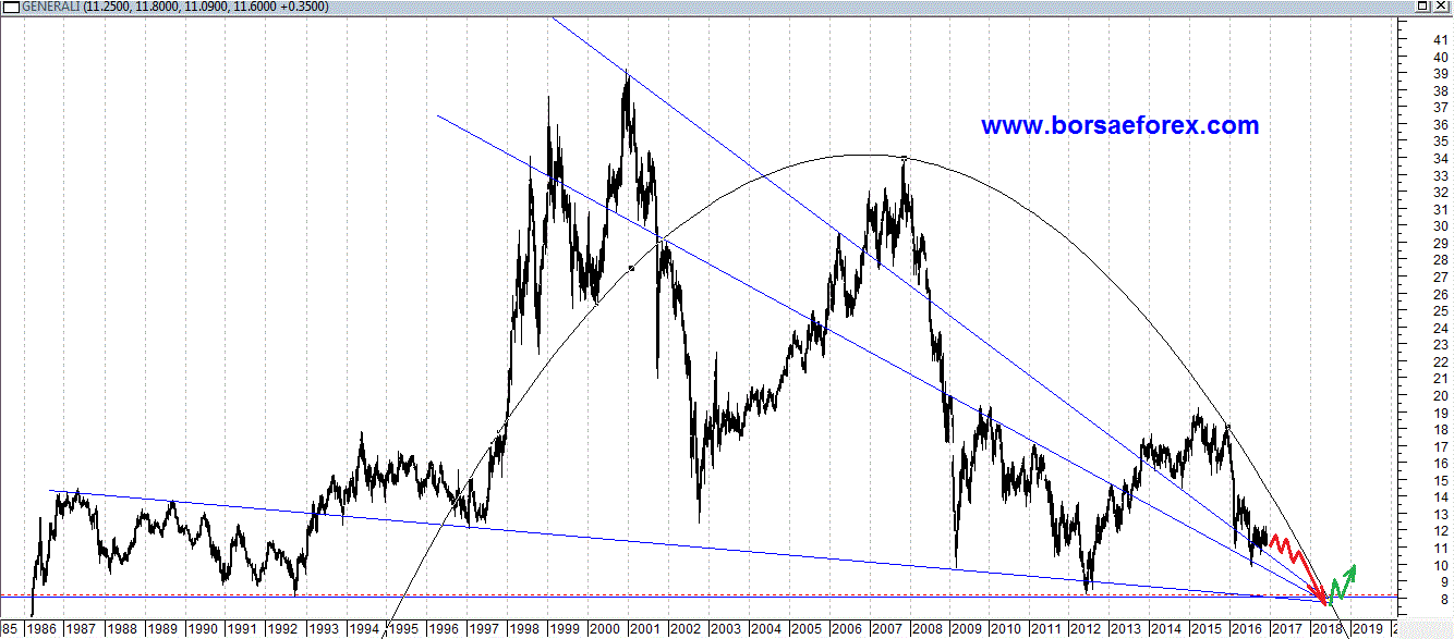 La discesa si protrarrà per tutto il 2017 e parte del 2018 quando raggiungerà e violerà il minimo del 2012 a 8,15 euro.