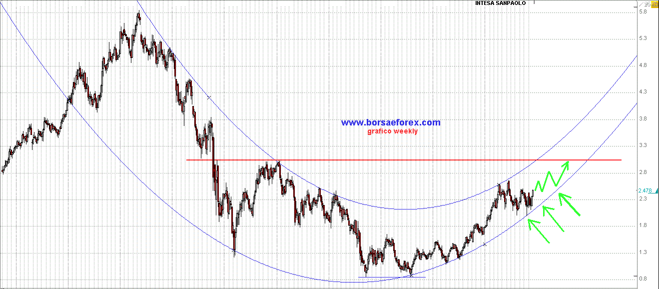 Nel grafico di Intesa Sanpaolo al momento sembrerebbe più probabile che i prezzi si muovano al rialzo percorrendo il canale fino ai 3 euro che ad oggi sembra essere l'obiettivo più probabile.