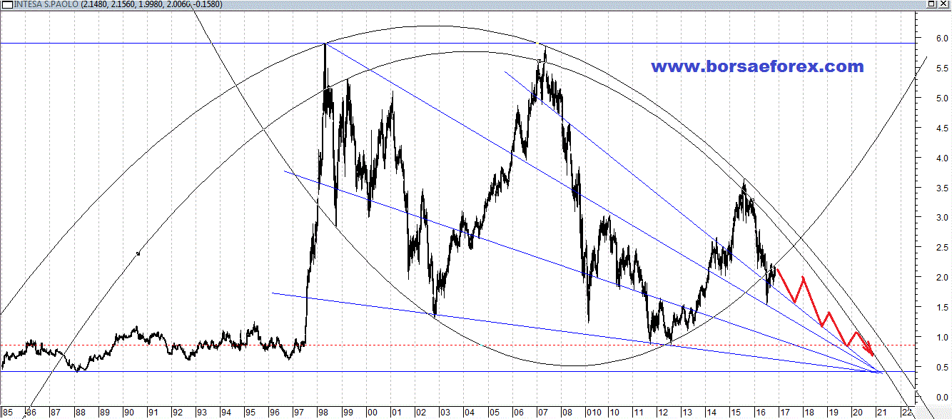 E dal grafico di Intesa non arriva nulla di buono visti che la formazione dei prezzi segue un ventaglio di linee di tendenza che convergono verso un punto posizionato a meno di 0,8 nel 2020-2021 con una perdita di circa il 60% dal valore odierno.