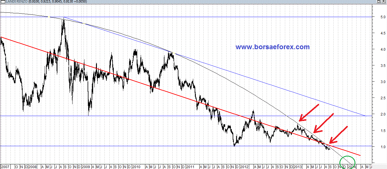 Ad agosto il titolo ha violato il supporto a un euro e sta ora testando i 0,9 euro. A mio modo di vedere il movimento in corso è la propaggine finale di un ciclo pluriennale negativo che potrebbe concludersi alla fine del 2013 o al massimo a gennaio 2014 quando, ormai asfittico, dovrebbe riprendere quota verso un nuovo ciclo positivo.