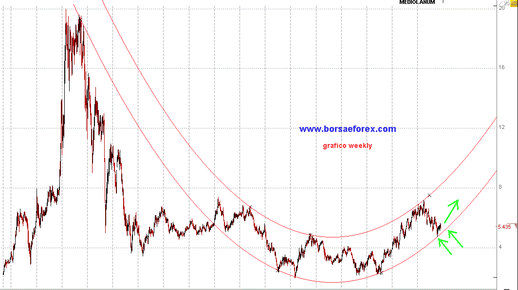 Si tratta di un canale parabolico che così strutturato in passato ha accompagnato altri titoli al rialzo almeno fino al più recente e importante massimo. Nel caso di Mediolanum si tratta di un massimo a 7 euro che vorrebbe dire un incremento di almeno il 40%.
