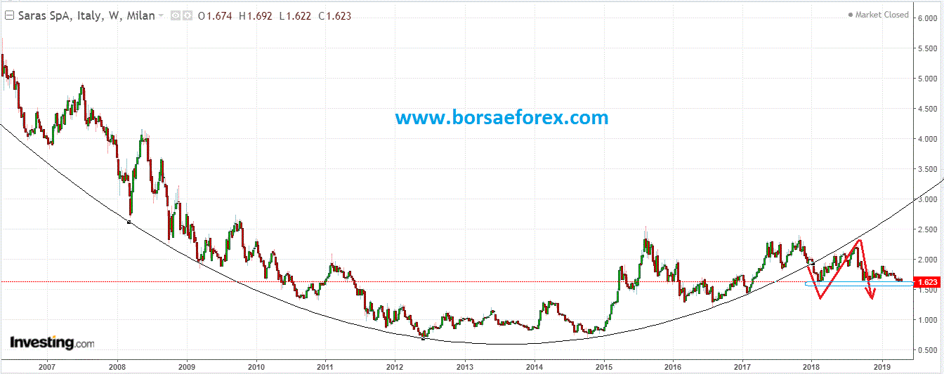 Fra alti e bassi, alla fine del 2017, con la formazione di un forte gap, i prezzi hanno violato l'evolvente parabolica di supporto di lungo periodo. Si è poi formato un pullback ribassista seguito da un anomalo periodo di lateralità. Oggi sul grafico è visibile a 1,62 l'azione degli anestesisti del mercato che hanno stoppato i valori su questo livello.