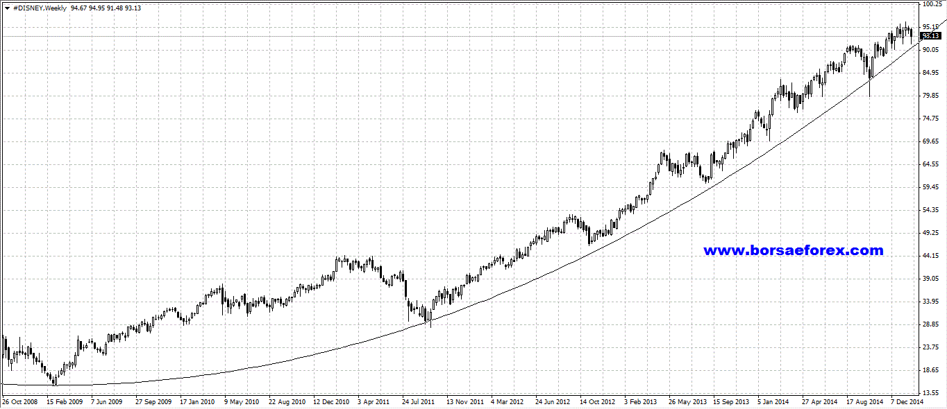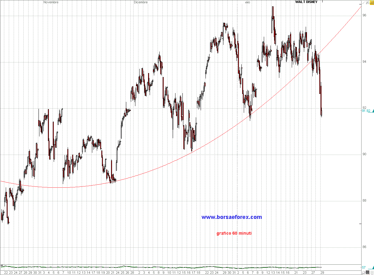 E' scattato lo stop loss su Disney ed oggi ho chiuso l'operazione long che avevo aperto il 23/12/2014 a 94,62. Nel grafico a 60 minuti è evidente la violazione al ribasso del supporto di breve termine. A questo punto è molto probabile che la discesa si estenda fino al supporto di lungo termine del canale parabolico disegnato sul grafico settimanale che trovate più sotto.