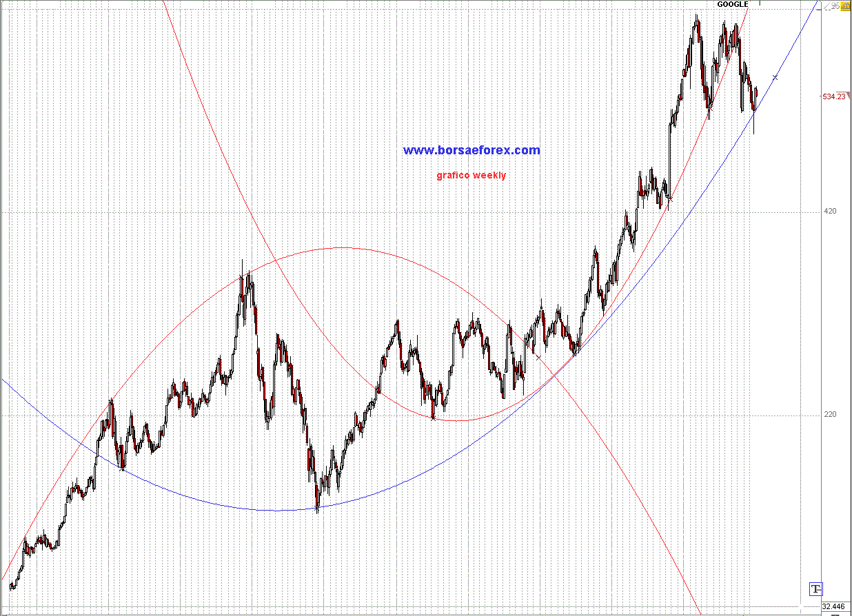 Per ora mi limito ad un grafico settimanale con il quale studio il trend primario che come il resto del mercato americano è rialzista. la particolarità di questo grafico riguarda le due evolventi paraboliche rosse che hanno dato due segnali estremamente interessanti per il trading. Il primo segnale riguarda l'evolvente parabolica che come una cupola sovrastava il grafico la cui violazione rialzista del 2011 ha aperto la stagione della corsa dei prezzi fino al massimo storico del marzo scorso. Poi a fine settembre l'altra evolvente parabolica di supporto viene violata lasciando scivolare al ribasso i prezzi fino ai giorni nostri.