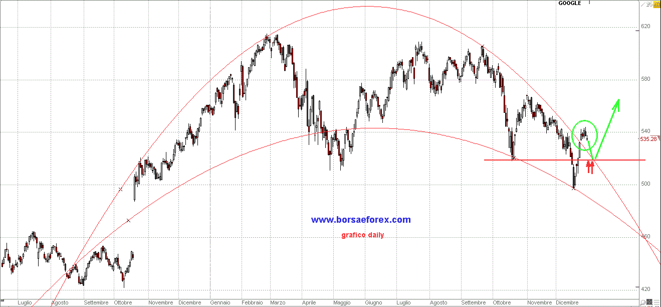 Come potete osservare voi stessi in corrispondenza del livello 520-525 dollari si incrociano il supporto statico e l'evolvente parabolica di resistenza che nel giro di qualche giorno dovrebbe cambiare la sua funzione in supporto e dare la spinta per un rilancio dei prezzi.