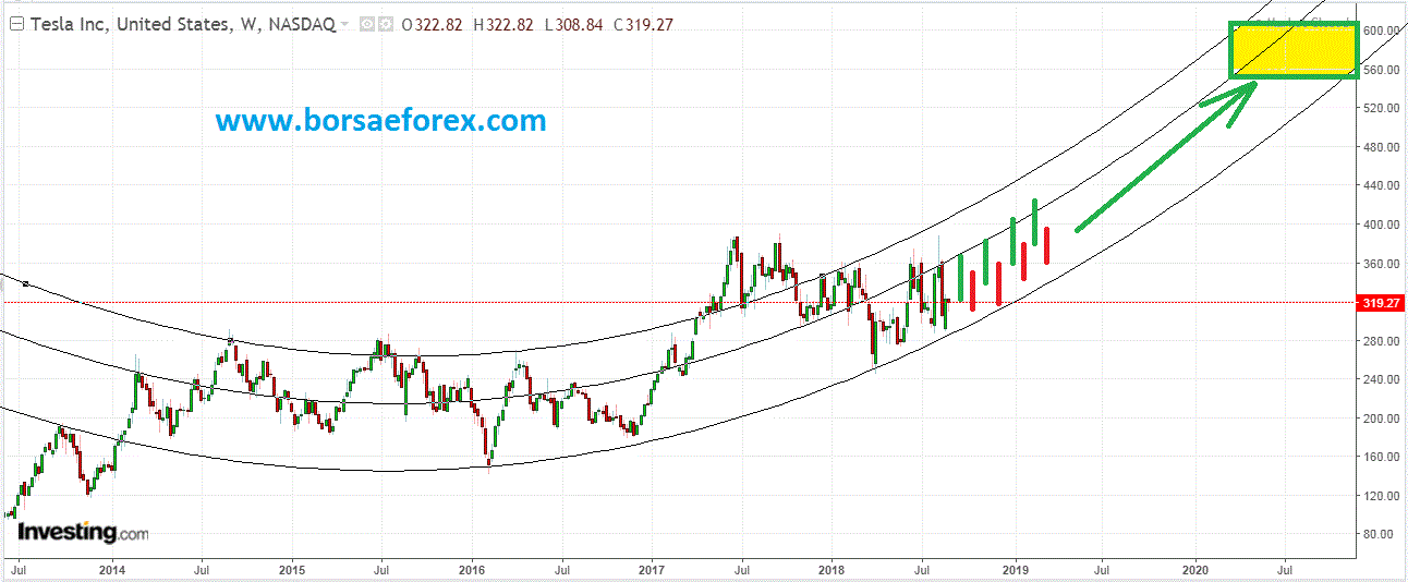 Riprendo in mano i grafici archiviati qualche giorno fa e vi mostro dove può arrivare Tesla. Se il supporto dovesse reggere fra un anno e mezzo i valori di Tesla potrebbero essere giunti in area 500 dollari. Mentre scrivo oscilla intorno ai 304 dollari in prossimità del supporto. Vedete un po' voi.