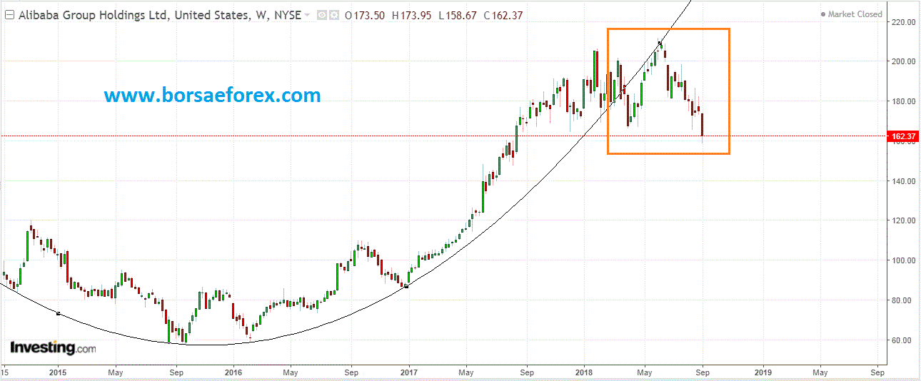 A sostegno di questa ipotesi vi propongo un grafico simile a quello di Tesla. Le dinamiche sono le medesime, si tratta di Alibaba. Anche qui dopo la violazione dell'evolvente parabolica di supporto ed un iniziale ribasso c'è stato un ritorno sotto l'evolvente parabolica che si è trasformata in resistenza. La differenza é che Jack Ma non é andato in video a fumare e a bere.