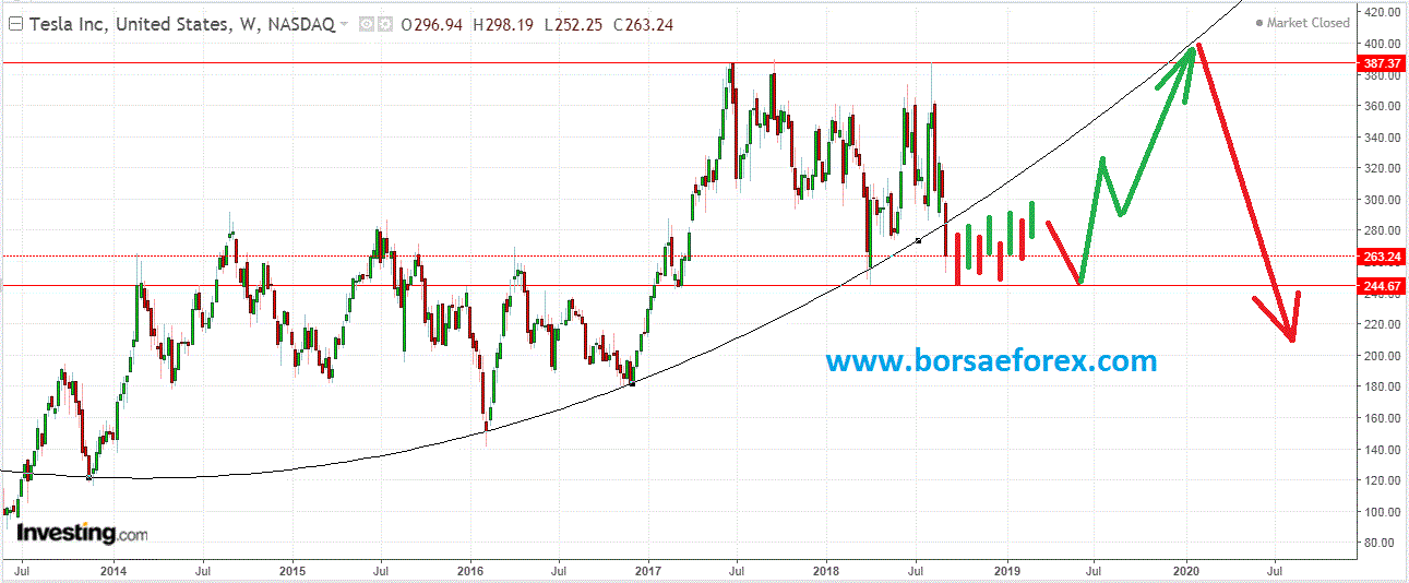 Le evolventi paraboliche, come le linee rette di supporto e resistenza, quando vengono violate solitamente cambiano la loro funzione: se erano supporto diventano resistenza e se erano resistenza diventano supporto. Lo scenario che credo andrà a svilupparsi potrebbe essere quello disegnato sotto con un titolo che si assesterá oscillando in area 250 per poi chiudere il ciclo rialzista con un massimo storico entro il 2020, ma di questo ne riparleremo al momento opportuno.