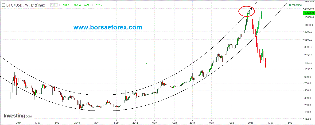 Il movimento dei prezzi del bitcoin degli ultimi due anni si è mosso all'interno di un canale parabolico la cui evolvente parabolica di resistenza è stata raggiunta in queste settimane.