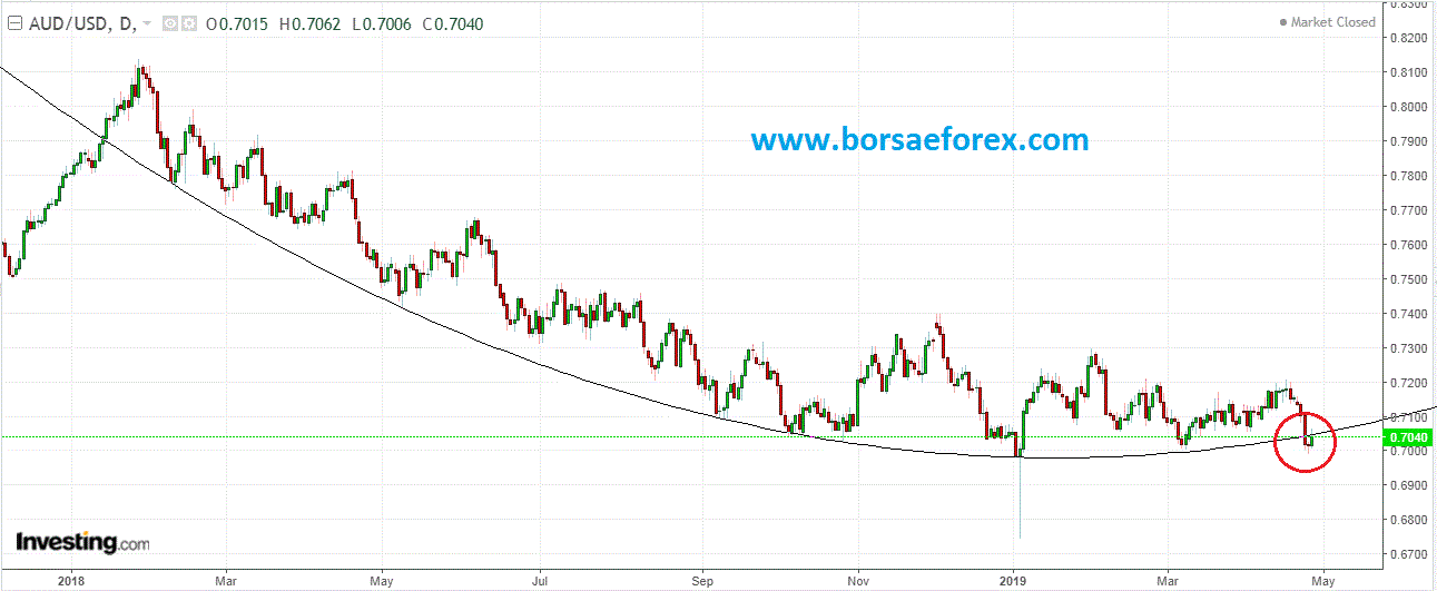Stesso discorso vale per il grafico daily del cross AUDUSD anche se in questo caso i punti di contatto sono “solo” quattro. In questo caso però già ieri c'è stato il rimbalzo sotto l'evolvente parabolica che si è stabilizzato chiudendo sotto il supporto violato mercoledì.