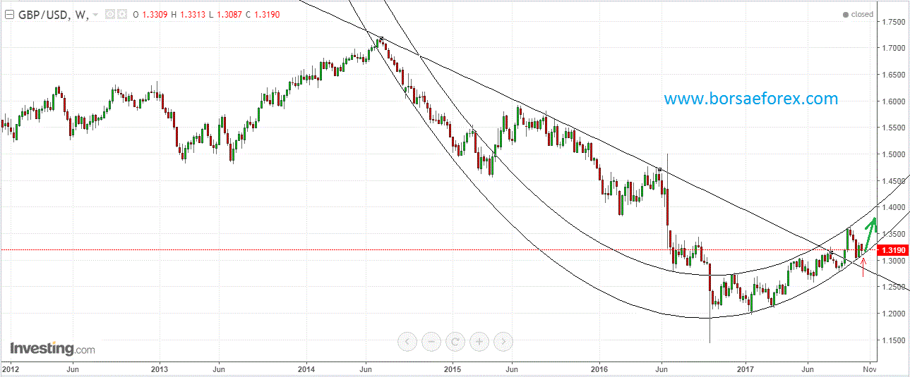 Nelle ultime sette settimane per il cross GBPUSD sono successe cose importanti, perlomeno dal punto di vista grafico. Nella settimana dal 4 al 8 settembre c’è stata la violazione della trend line di resistenza dinamica che da tre anni guidava il ribasso della sterlina. Il segnale rialzista ha generato un rapido rialzo anche nella settimana successiva, seguita da un susseguirsi di assestamenti dei prezzi che sono tornati progressivamente in area 1,31 dove è ritornato l’interesse per i rialzisti.