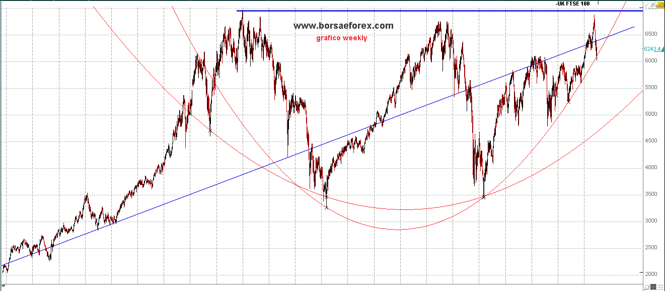 Oggi analizzo il FTSE100 di Londra che pur non mostrando segnali negativi appare debole al confronto con il mercato americano. A Londra come in tutto il resto d'Europa c'è preoccupazione per la crisi e l'indice FTSE 100 ne mostra gli effetti non avendo ancora trovato la forza di superare i minimi precedenti.