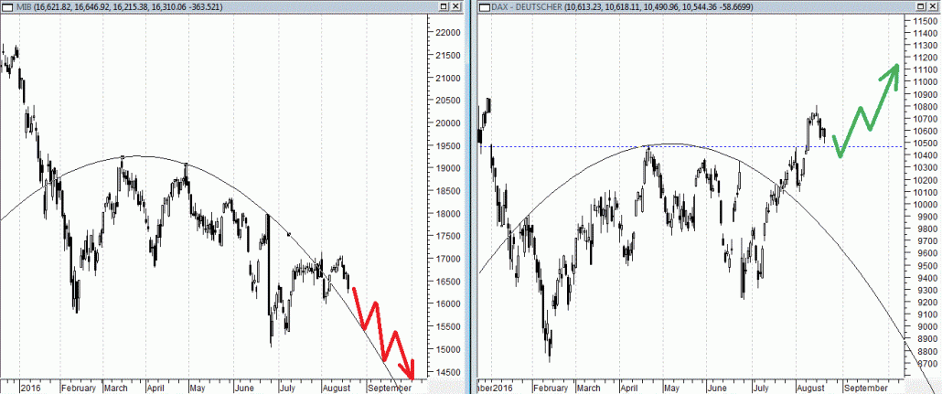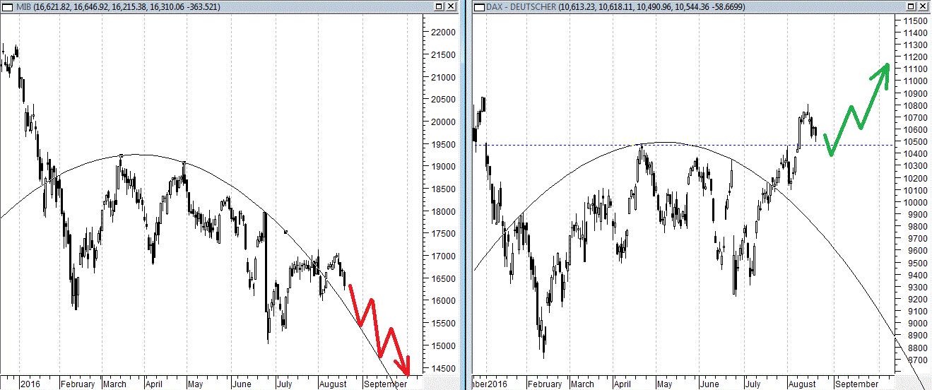 Lasciamo per ora le analisi di lungo periodo è limitiamoci al periodo gennaio-agosto 2016 che mostra due situazioni molto diverse. L'indice tedesco ha violato l'evolvente parabolica di resistenza con un movimento energico inclinato a 45 gradi e si sta preparando per un futuro rialzista di tutto rispetto, viceversa l'indice italiano ha faticato a violare l'analoga evolvente parabolica sulla quale ora rischia di scivolare verso nuovi minimi.