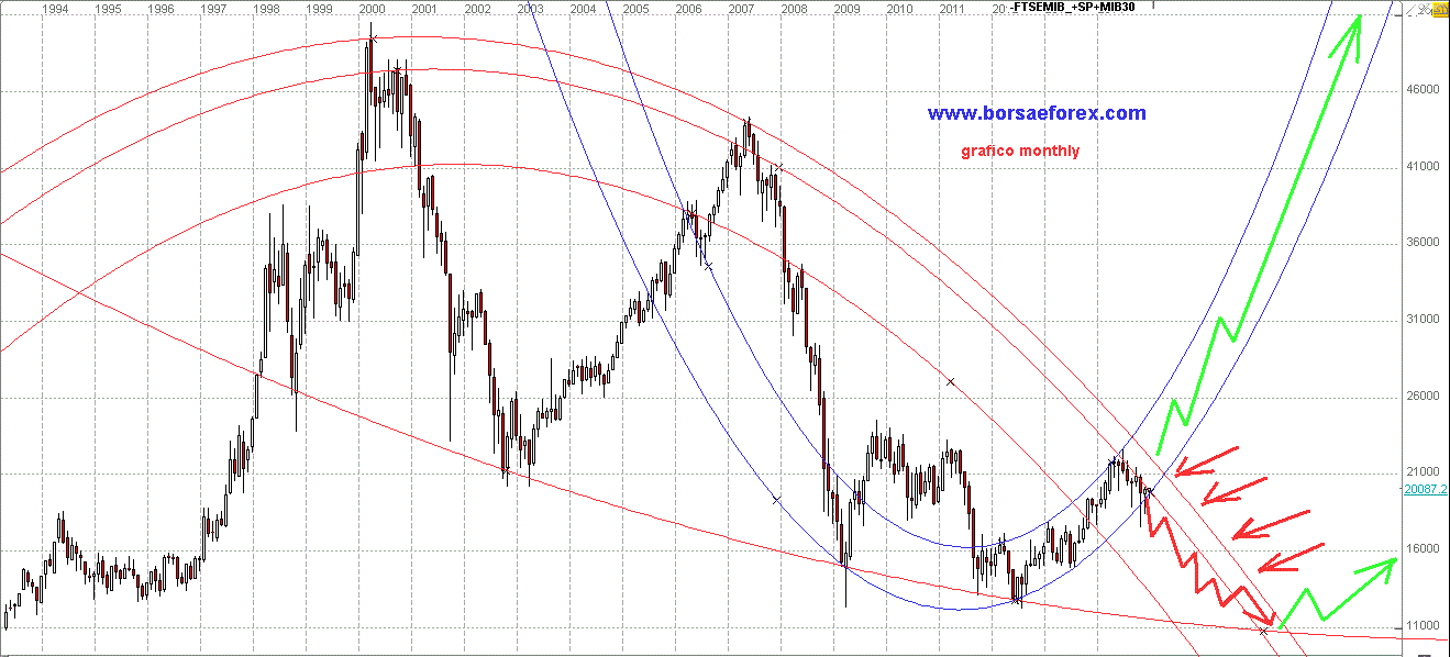 Nel precedente post avevo scritto: Graficamente l'ostacolo principale allo sviluppo rialzista è rappresentato dall'evolvente parabolica di resistenza che sovrasta tutto come una campana. A meno di un forte shock sui mercati, ora difficilmente ipotizzabile, il mercato italiano scenderà verso gli 11000 punti senza riuscire a violare le resistenze. Solo nella seconda metà del 2017 qualcosa cambierà e tornerà la fiducia sul mercato italiano.