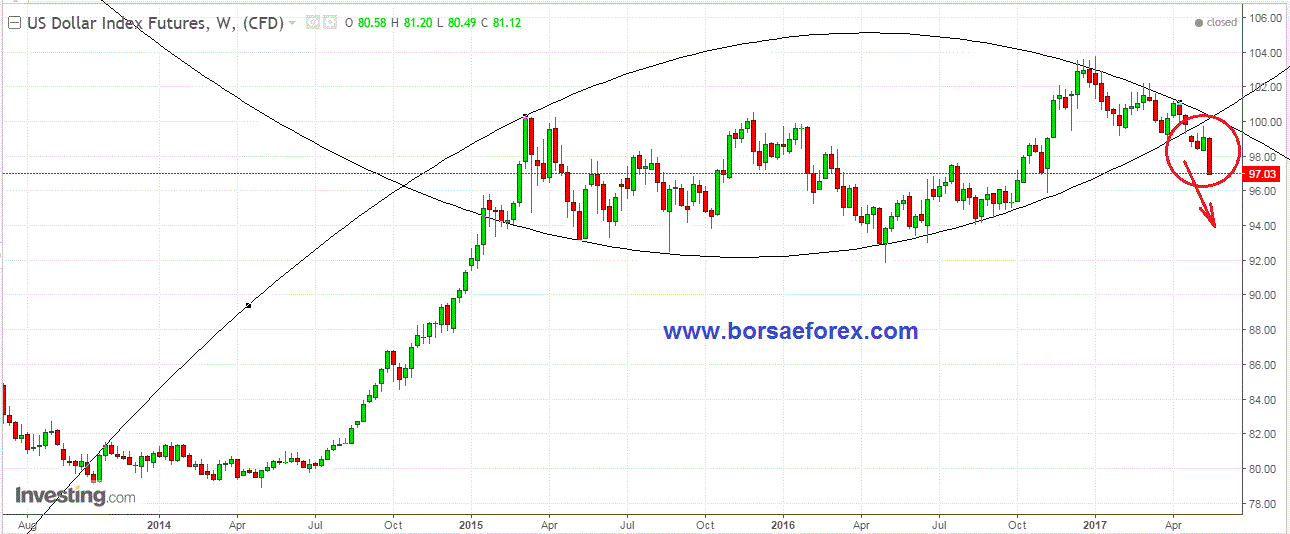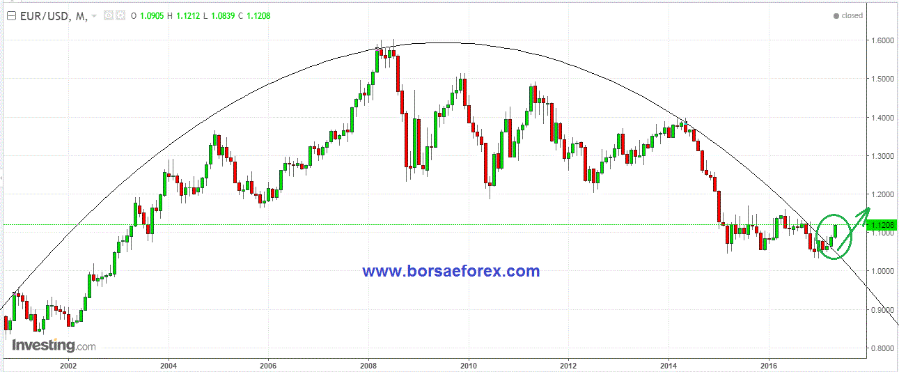 Il primo grafico mostra il Dollar Index sul quale ho evidenziato l'area di debolezza da cui è scaturita la violazione ribassista di queste ultime settimane. Il secondo grafico riguarda il cross EURUSD che di conseguenza mostra un euro forte in risalita che creerà non pochi problemi all'esportazione dei prodotti europei.